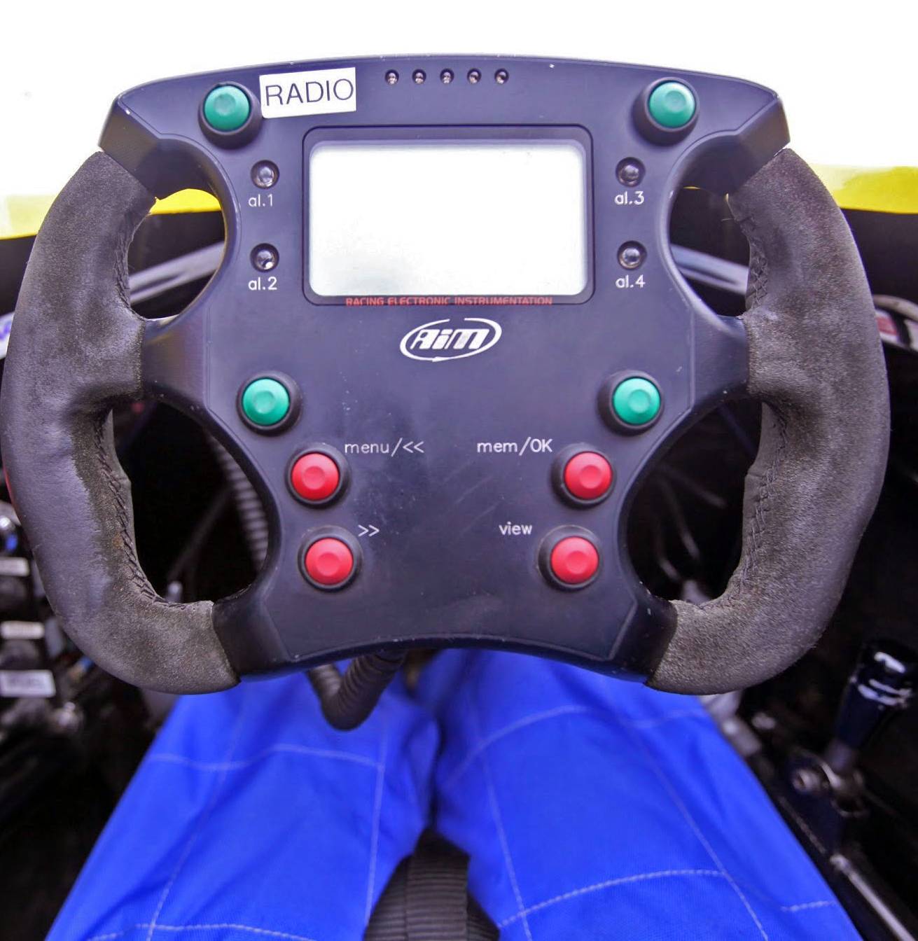 The gear shift is a rather small, flimsy lever at the right of the car, and the ignition is a big red button on the left. Next they screwed in the steering wheel, which was smaller than I thought it would be, and resembled something you’d see in an arcade. It was covered with warning lights and information like lap times, oil, water and gearbox temperatures and fuel mileage.