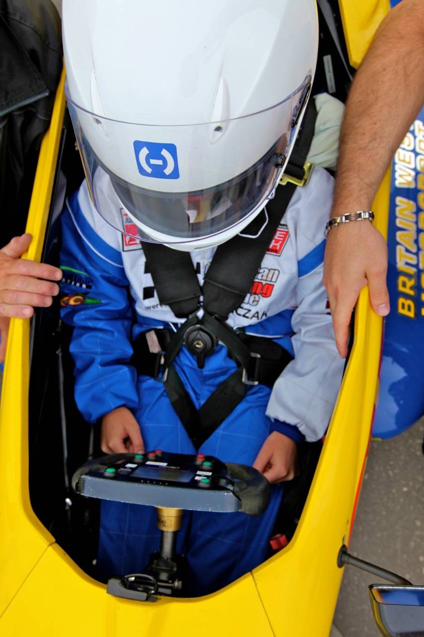 Heart beating, I hoisted myself into the narrow cockpit. It was then I realized that this sport wasn’t designed for big-boned people, or even medium people. My legs didn’t quite reach the pedals, so they put in an extra cushion behind my back. Next they clamped me in tight with the seat-belt: It’s a strange feeling being fastened so tightly to a machine. If you roll over the vehicle you’ll be safely locked into place, but I couldn’t help but feel restricted.