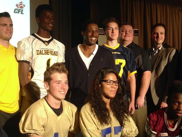 Toronto Argonauts slotback Andre Durie, centre, is surrounded by high school players and coaches from across Canada who will benefit from the ‘Back in the Game’ program.Darren McGee/The Globe and Mail