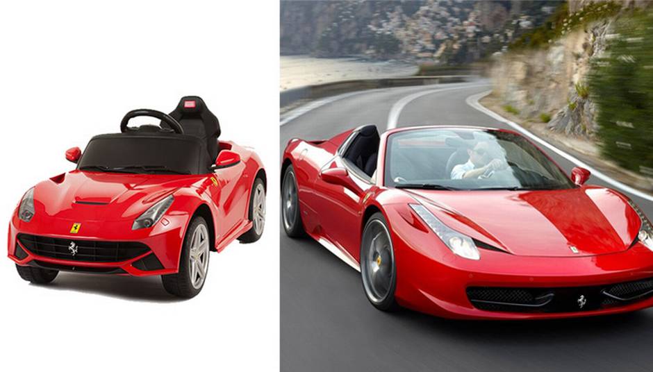 Feber Ferrari California Classic Car Ride-On: $449.99, 12V battery. Comes with official Ferrari stickers and badges plus imitation seat belts.