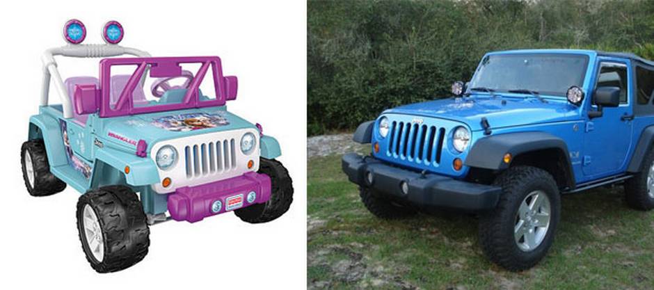 | Fisher-Price Disney Frozen Jeep Wrangler: $279.99, 12V battery. Features roll bars and a 'radio' that only plays songs from Frozen. Jeep Wrangler: $20,695, 285 horsepower. Features a fold-down windshield, removable doors and four-wheel drive. |
