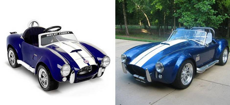 Shelby Cobra Ride-On: $279.99, 6V battery. Features Chrome hubcaps and body parts.
