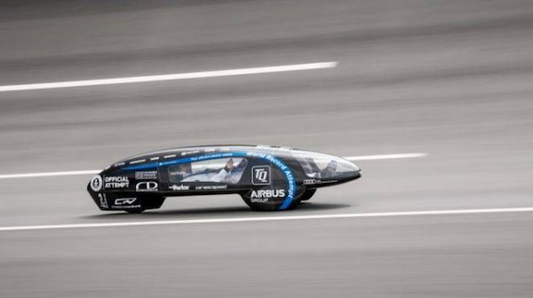 The TUfast Eco Team car, with its driver lying down in the teardrop-shaped, three-wheel car makes its way around Audi’s test track in German.