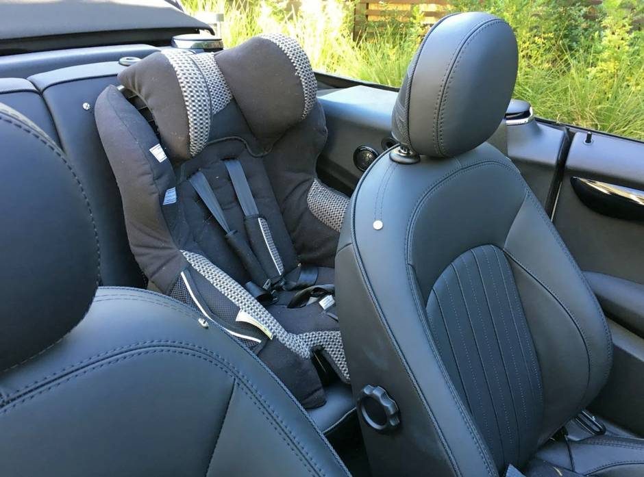 The roof came down whenever it was time to put the six-year-old and 18-month-old in the rear seats. Lifting them over the gunwale of the Mini was easier than squeezing behind the front seats. The full-size child seat for the youngster ate up a lot of room, and the small booster seat for my older child left her with no legroom with the driver’s seat in a comfortable position.