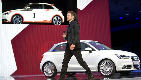 Singer Justin Timberlake presents the new Audi A1 at the Geneva Motor Show in Geneva, Switzerland, Tuesday, March 2, 2010.Martin Meissner