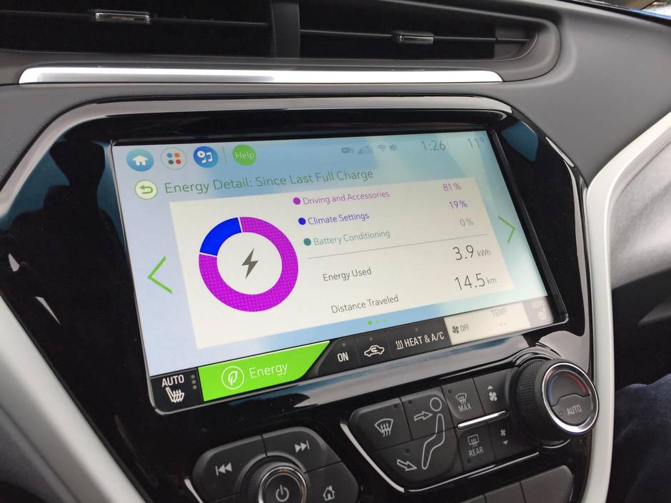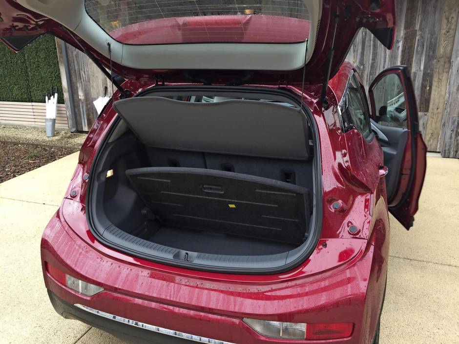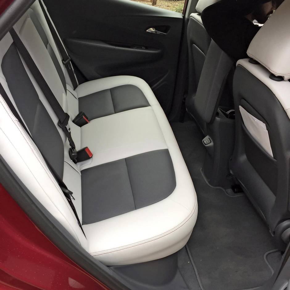 Heisel, who is 6 foot 4, has no problem folding his long legs into the front seat of the Bolt, which has been designed to optimize interior space. The lack of gas engine and all of its connecting parts enabled designers to keep the floor flat in both the front and back. In the front, that means room for a handbag or briefcase beneath the floating dash, a centre console with side-by-side cupholders and a pocket for built-in induction phone charging. In the rear, where there is still enough space to fit a six-foot-tall person behind Heisel, two passengers fit comfortably, but you could squeeze three. The flat floor there means passengers can easily scoot across the bench to exit at either door; a fifth passenger wouldn’t have to sit with knees jammed up in the chest. The design is a slam dunk for ride-sharing companies and their passengers.