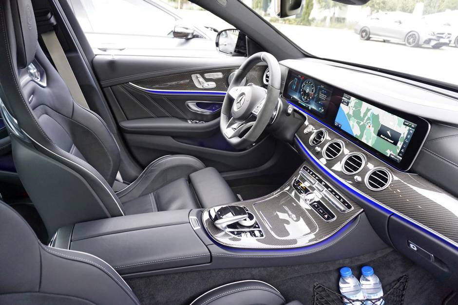 Interior: A biggie was the optional Performance seat, which made the E63 the first new-generation E-Class I’ve driven with a just-right-for-me range of seat adjustment. The cockpit is dominated by the new E’s massive twin-12.3-inch screens behind a single glass pane, which arguably looks at odds with the otherwise organically sculpted dashboard. The AMG has its own version of the “virtual” Sport gauge cluster (one of three available) and can display such information as lateral and longitudinal g, engine power and torque, and turbo boost.