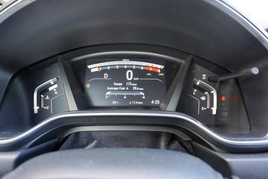 Interior: The CR-V always was a paragon of packaging efficiency and the 2017 takes that to the next level. Best-in-class rear head- and leg-room provide ample stretch and sprawl space, and the back bench is comfy too (though, oddly, rear hip room is down significantly). Twelve-way power driver-seat adjustment on most trims is a bonus, but a tall-in-the-saddle posture was easier to find on the old model. The presentation of the 7-inch touchscreen strikes an unusual compromise between the free-standing and integrated schools of design, while we welcome the round knob for audio on/off/volume. But then Honda goes a bit weird on us with a gauge cluster devoid of round dials: the speedo is digital, the tacho a vaguely 50s-ish horizontal strip and the ancillary gauges are shaped like boomerangs.