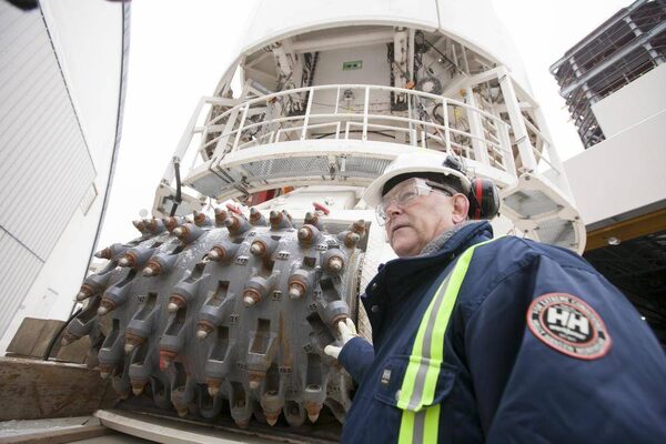 John Stubbs, Jansen project manager, with the Herrenknecht driller that will be used at the BHP Jansen mine.DAVID STOBBE/The Globe and Mail