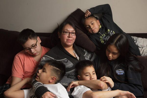 Valerie Strawberry, centre, at home in Red Deer with her children. From left, Layken, 14, Jyris, 11, Jayven, 11, Celisity, 16, and Jehren, 8.Amber Bracken/The Globe and Mail
