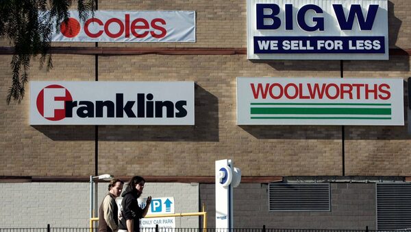 Pedestrians walk past retail advertising signs outside a shopping mall in SydneyWILL BURGESS