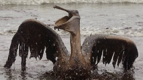 A brown pelican is seen on the beach at East Grand Terre Island along the Louisiana coast on Thursday, June 3, 2010. Oil from the Deepwater Horizon has affected wildlife throughout the Gulf of Mexico.Charlie Riedel