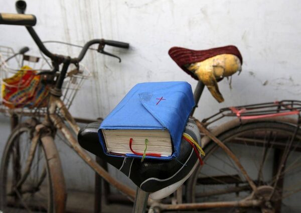 A bible is placed on a bicycle saddle at an underground Catholic church in Tianjin November 10, 2013.Kim Kyung Hoon/Reuters