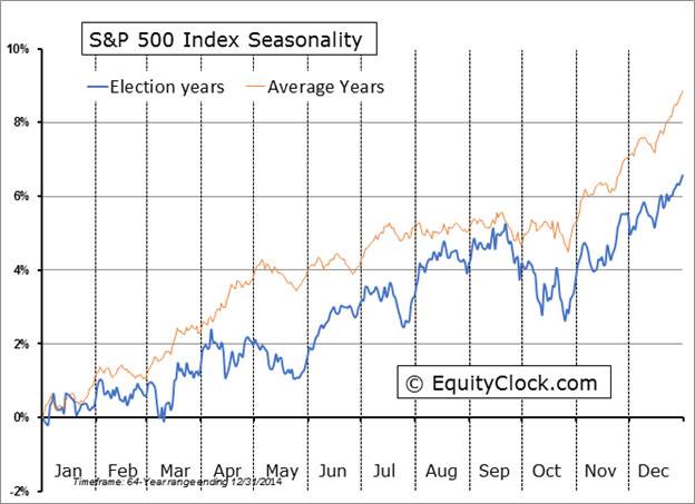 A study by EquityClock on performance of the S&P 500 Index during presidential election years, based on data for the past 65 years, shows that the Index slightly underperformed average years by realizing a return per period of 6.7 per cent while recording significant seasonal variations from average during the year.