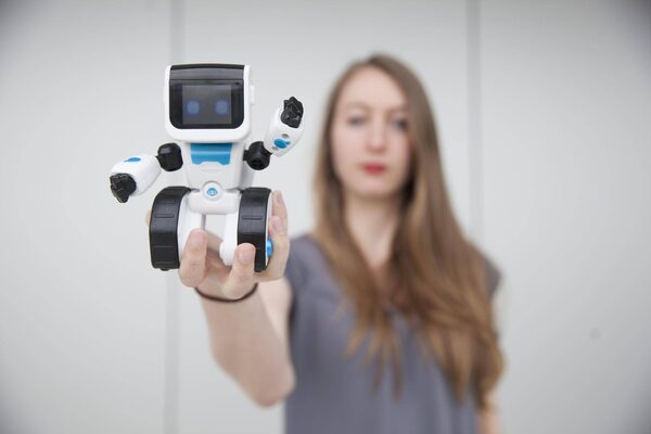 Erika Burdon, lead developer at Responsive AI in Vancouver, with company mascot ‘Alpha,’ a toy made by WowWee. Davyde Wachell, CEO of the firm says, ‘It’s not about robo-advising. It’s about using a tool to take the pressure off your business, saving time and money.’ Alison Boulier