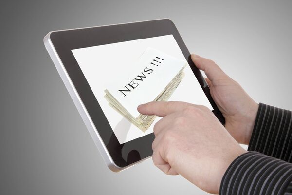 A man reads an online newsletter on his tablet device.