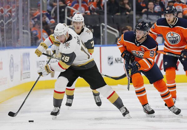 Vegas Golden Knights forward Reilly Smith (19) skates with the puck as Edmonton Oilers forward Connor McDavid (97) defends during the second period at Rogers Place on Nov 14, 2017 in Edmonton, Alberta.Perry Nelson