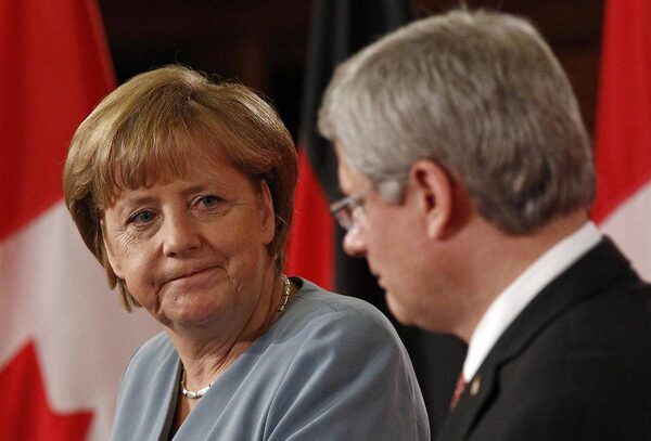 Germany's Chancellor Angela Merkel takes part in a news conference with Canada's Prime Minister Stephen Harper on Parliament Hill in Ottawa August 16, 2012.CHRIS WATTIE/Reuters