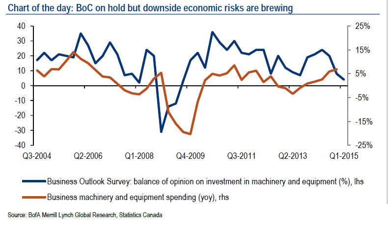"Ultimately, we recommend fading USD/CAD weakness post-BoC," she writes. "We do not see the BoC cutting rates until 4Q15, but risks remain on the downside to the economic outlook with the energy shock giving the FX market comfort in maintain its short CAD position."