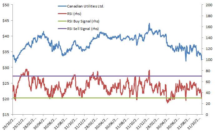 I picked the utility stock – Canadian Utilities Ltd. (CU-T) as the focus chart this week. The good news is that RSI has worked extremely well in uncovering buy and sell signals for Canadian Utilities stocks in the past three years.