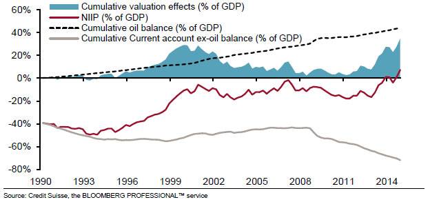 Oil's fingerprints are all over the improvement in Canada's net international investment position, as the cumulative trade surplus in oil surged since 1990. The current account – the sum of the trade balance of goods and services, income earned or sent abroad on foreign investments, and net transfer payments with the rest of the world – has deteriorated since the financial crisis once oil is stripped out of the equation. This "underlying trend" of the net international position is conducive to further Canadian dollar weakness, according to Credit Suisse.