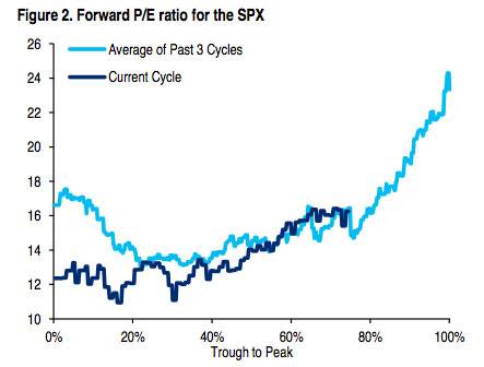 The forward price-to-earnings ratio on the S&P 500, for instance, is consistent with a recovery that it is approximately three-quarters from its finale: