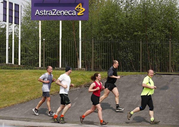 Runners jog past an AstraZeneca site in Macclesfield, central England April 28, 2014.Darren Staples/Reuters