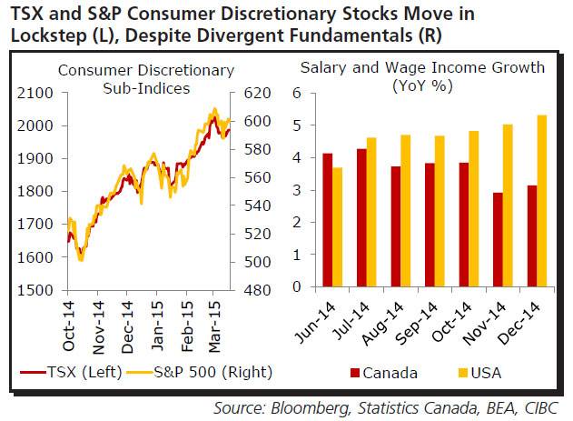 Accordingly, Mr. Exarhos concludes, "Though rapid gains seen in the U.S. labour market may not be matched by developments in Canada, there may still be value in consumer discretionary stocks, as TSX investors seek haven amidst the oil rout and a somewhat more muddled Canadian economic landscape."