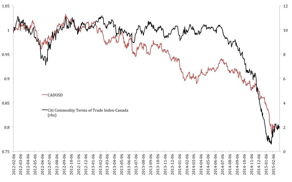 The hoped-for transition from oil- and Alberta-led national growth to a focus on manufacturing exports from central Canada would see the domestic currency outperform the Citi Commodity Terms of Trade Index. The Citi index measures the price of commodities exported by Canada. The index is weighted by the average volume of commodity exports that actually occur so it is heavily influenced by energy prices.