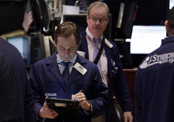 In this Thursday, April 3, 2014, photo, Trader Dudley Devine, left, works on the floor of the New York Stock Exchange.Richard Drew/The Associated Press
