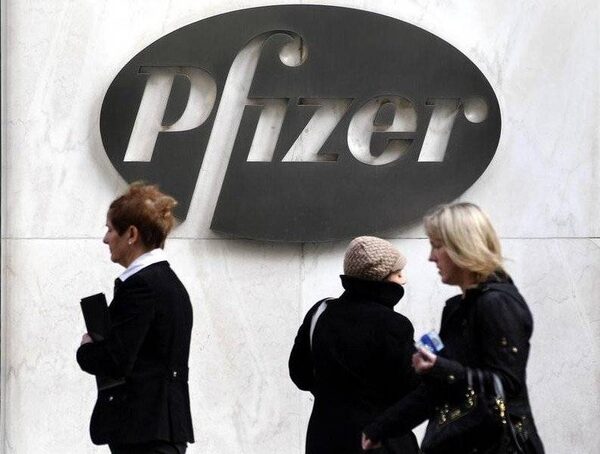 Pedestrians walk past the Pfizer logo on the exterior of their headquarters in New York Nov. 5, 2013.Adam Hunger/Reuters