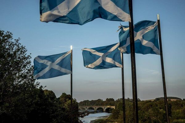 Scottish flags fly near the bridge over the River Tweed in the border village of Coldstream, Scotland, Sept. 10.ANDREW TESTA/The New York Times