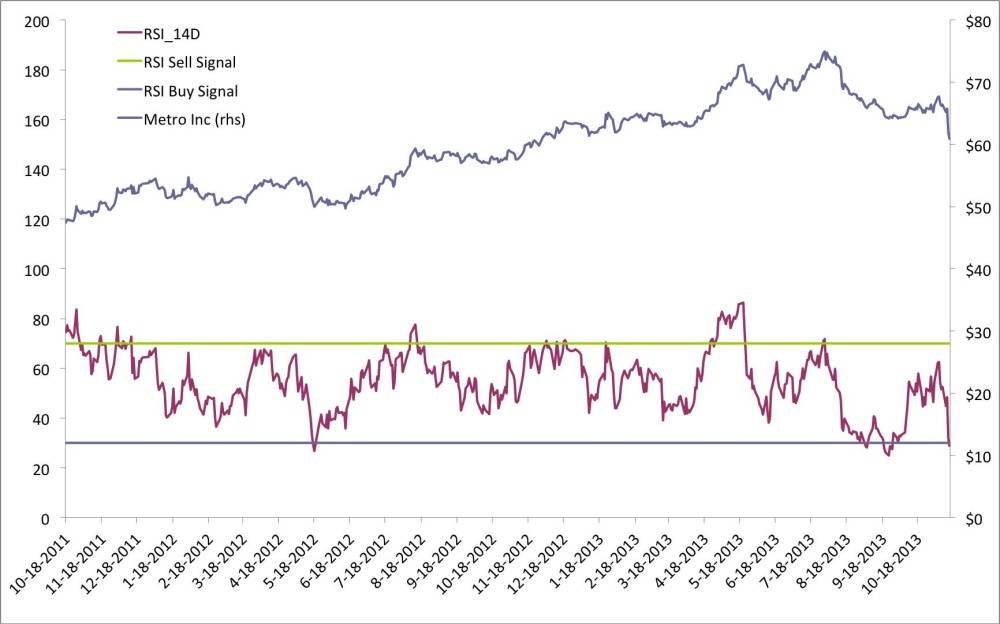 As always, screening the benchmark by technical measures like RSI is a great first step but not sufficient grounds for buying and selling stocks on its own. More homework is required. For my part, I’m going to start with Metro Inc.