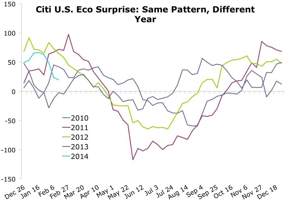 For Canadian investors looking to add to U.S. equity holdings, this is good news in a roundabout way. The surprise index has followed the same pattern since 2010 with early strength turning to disappointment in Late February or March.