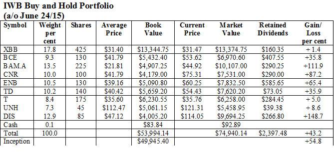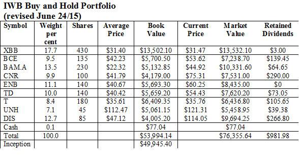 Here is the status of the portfolio as of the morning of June 24. For simplicity, the Canadian and U.S. dollars are considered to be at par, although obviously the differential in the currencies makes U.S. dollar dividends and capital gains more valuable to Canadian investors. Trading commissions are not factored in although in a buy and hold portfolio they are not significant in any event.