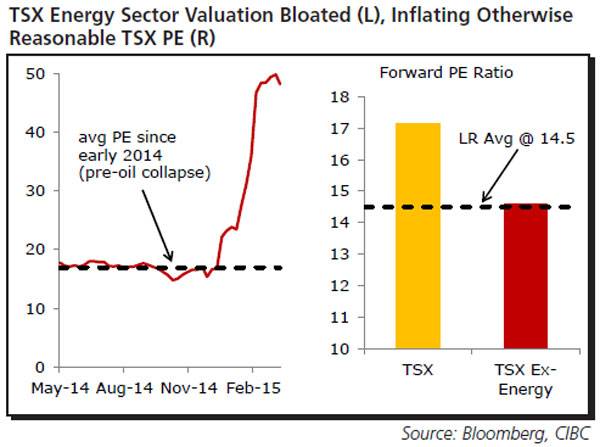 In CIBC World Markets weekly note, economist Nick Exarhos points out that the energy sector's forward P/E is a whopping 48.2 times.