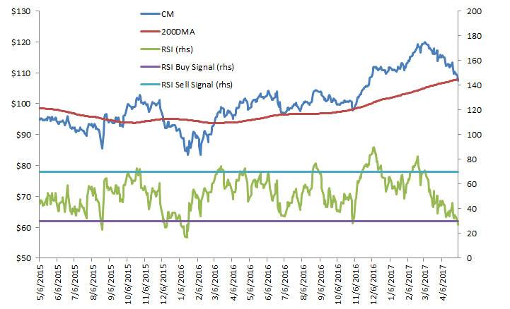 Two important things are evident from the chart: RSI buy signals have worked extremely well for CIBC stock and the 200 day-moving average has also been extremely important to stock movements in the past two years.