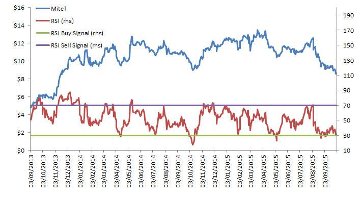 RSI has reliably identified profitable entry points for Mitel stocks in the past two years. A buy signal in April 2014 kicked off a 34-per-cent-rally and another in July 2014 was followed by an even better 44-per-cent rise in stock price. The RSI sell signal of 70 has been less reliable than the buy signal.