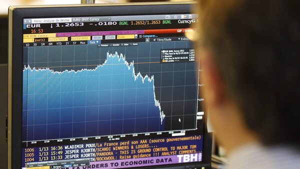 A trader watches a graph showing the fall of the Euro in Paris on Friday.The Associated Press