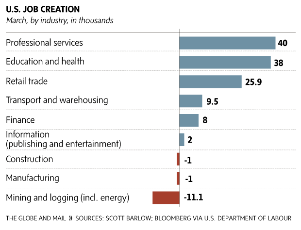 The bad news is that many of the most cyclical sectors of the U.S. economy – the industries that would grow fastest if growth were accelerating – had the worst results. Construction hiring was non-existent as the sector lost 1,000 jobs. A thousand manufacturing workers also lost their jobs in March. The real damage, however, was in the mining and logging category which includes oil and gas production. That industry shed more than 11,000 workers for the month.