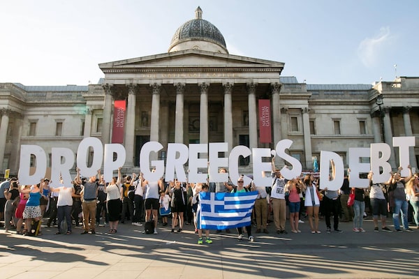 Demonstrators holding letters to form a banner take part in a protest against the European Central Bank, in Trafalgar Square, London, over Greece's debt repayments, Monday June 29, 2015.Daniel Leal-Olivas/The Associated Press