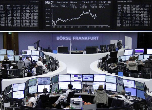Traders are pictured at their desks in front of the DAX board at the Frankfurt stock exchange June 3.Staff/Reuters