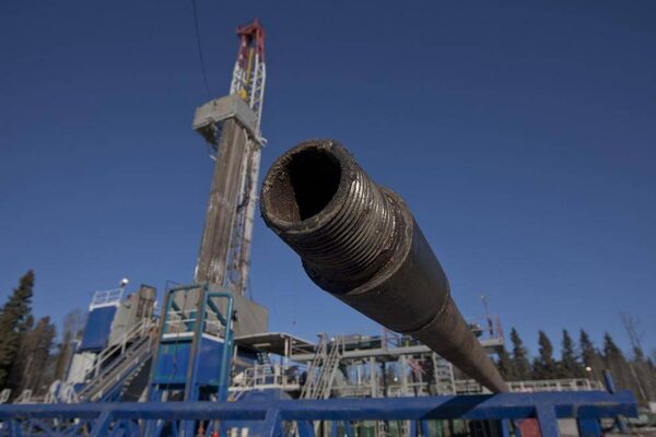 The threaded end of one of hundreds of drill pipes is shown in front of the Baytex Energy Ltd.'s Pembina oil rig near Pigeon Lake, Alta., on Feb. 17.Norm Betts/Bloomberg