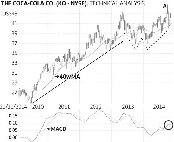 Coca-Cola Co. stayed in a long-term up-trend for several years (solid line). The stock then settled in an extremely bullish behaviour pattern known as a "W" formation (dotted lines). The recent rise to $44.87 (U.S.) signalled the breakout from the bullish "W" pattern and confirmed renewed investor sentiment (A). Current prices should provide a good entry level.