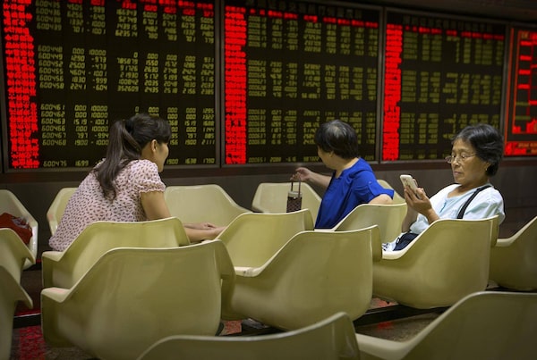A Chinese investor looks at her cellphone as others monitor stock prices at a brokerage house in Beijing, Tuesday, Aug. 18.Mark Schiefelbein/The Associated Press