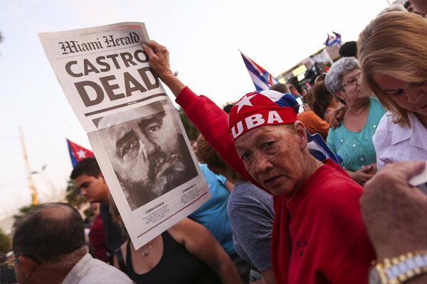 Ines Muiz, 57, holds the front page of the Miami Herald outside of the Versailles Restaurant in Miami's Little Havana on Saturday, Nov. 26, 2016, following the announcement of former Cuban leader Fidel Castro's death.Matias J. Ocner/The Associated Press