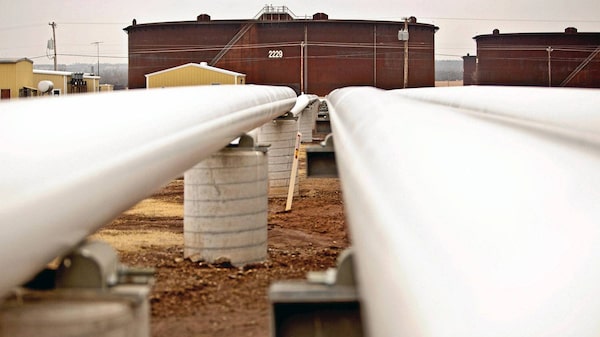 Oil pipelines run near storage tanks at the Enbridge Inc. Cushing Terminal in Cushing, Okla.Shane Bevel