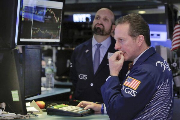 Specialists Glenn Carell, right, and James Denaro work on the floor of the New York Stock Exchange, Monday, March 27.Richard Drew/The Associated Press