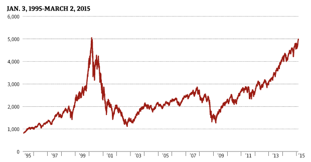Other U.S. stock market indexes like the S&P 500 and the Dow Jones Industrial Average have set dozens of new highs over the past few years, thanks in large part to the low interest rates and other stimulus delivered by central bankers in the wake of the financial crisis. But the Nasdaq index, which poked its nose over 5,000 on Monday for the first time in 15 years, is still short of its former glory.