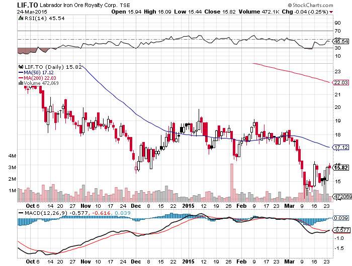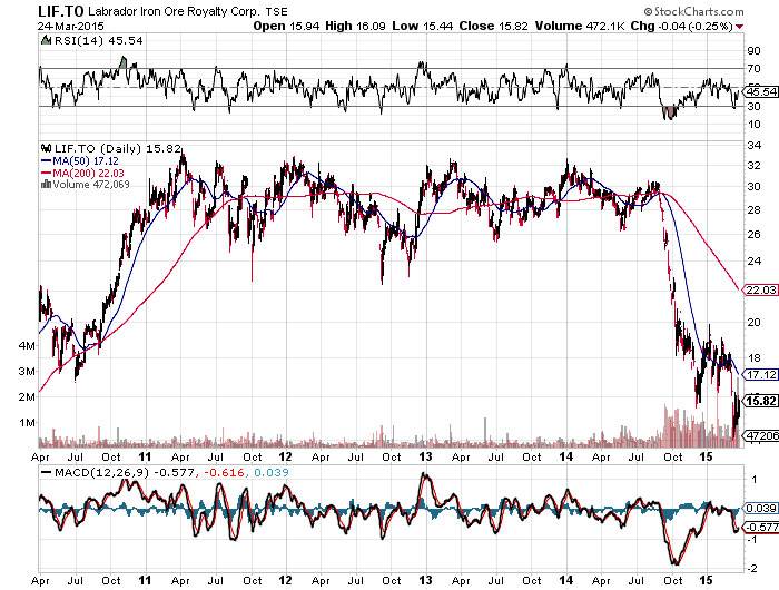 Thanks for the assignment. This will be the second time that I examine the case for Labrador Iron Ore Royalty Corporation. The last time was on Oct. 17, 2014. Kaissy asked for my views on the stock for the short and long term. The shares were trading for $19.21, and the investigation outlined shares that were in a free-fall and had relentlessly melted through various support levels. There were no indications that we could expect a trend reversal in the short term. Not surprisingly, LIF continued to sell off.